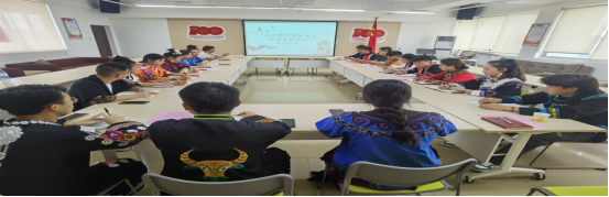 随着周新华老师结束讲话,同学作交流发言。20民特团委书记杜月凤同学说“没有共产党就没有新中国”,我们伟大的党为中华民族作出伟大的历史贡献。坚持中国共产党领导是历史和人民的选择,中国共产党没有辜负历史和人民。“唱支山歌给党听”作为新时代青年我们应以实现中华民族伟大复兴为己任,增强我们的理想信念,不负时代,不负韶华。“再唱山歌给党听”同学们,我们何其有幸生于华夏,见证百年风茂。在发言结束后,杜月凤同学说,语言已经无法表达她对党的热爱,所以她邀请了班上三位彝族同学共同演唱了一首《彝家儿女紧跟党》送给我们伟大的中国共产党。表示我们会永远坚定不移的跟党走。